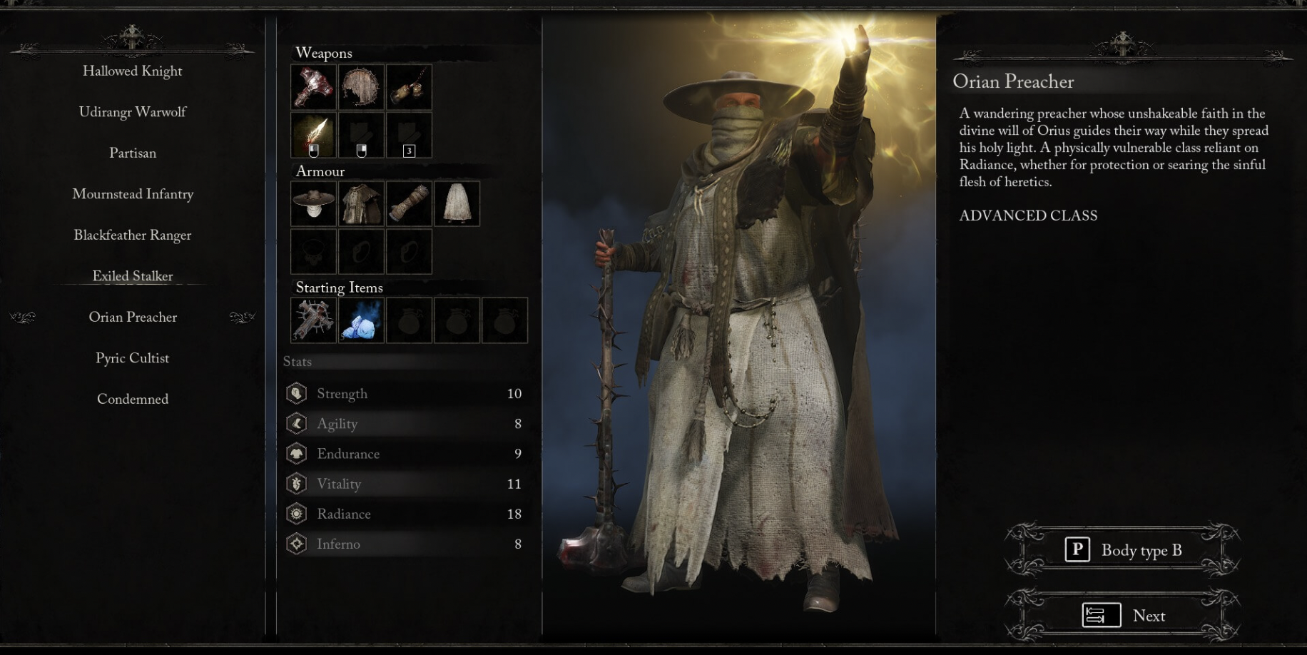 However, this comes with a great tradeoff in Agility, Endurance, and Vitality. Even more of a glass cannon than the Pyric Cultist, the Orian Preacher can do very little when swarmed. Though the hammer does more damage than the Cultist’s weak staff, at least the staff can swing fast and the Cultist has the stamina to swing it a lot, keeping back enemies so they can cast more spells.