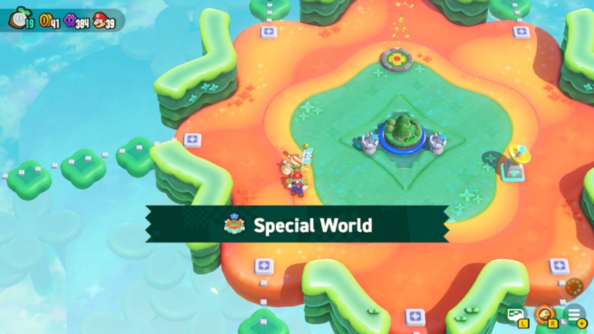 Refer to your Courses for a full overview of the worlds and their corresponding levels. You can keep track of your progress here. Simply click ‘+‘ inside the free-roam of a world for level selection and enter the ‘Courses‘ menu. When all Wonder Seeds and Purple Coins are collected, and every flagpole is mounted, enter the Special World in the post-game to unlock the Final-Final Test Badge Marathon.