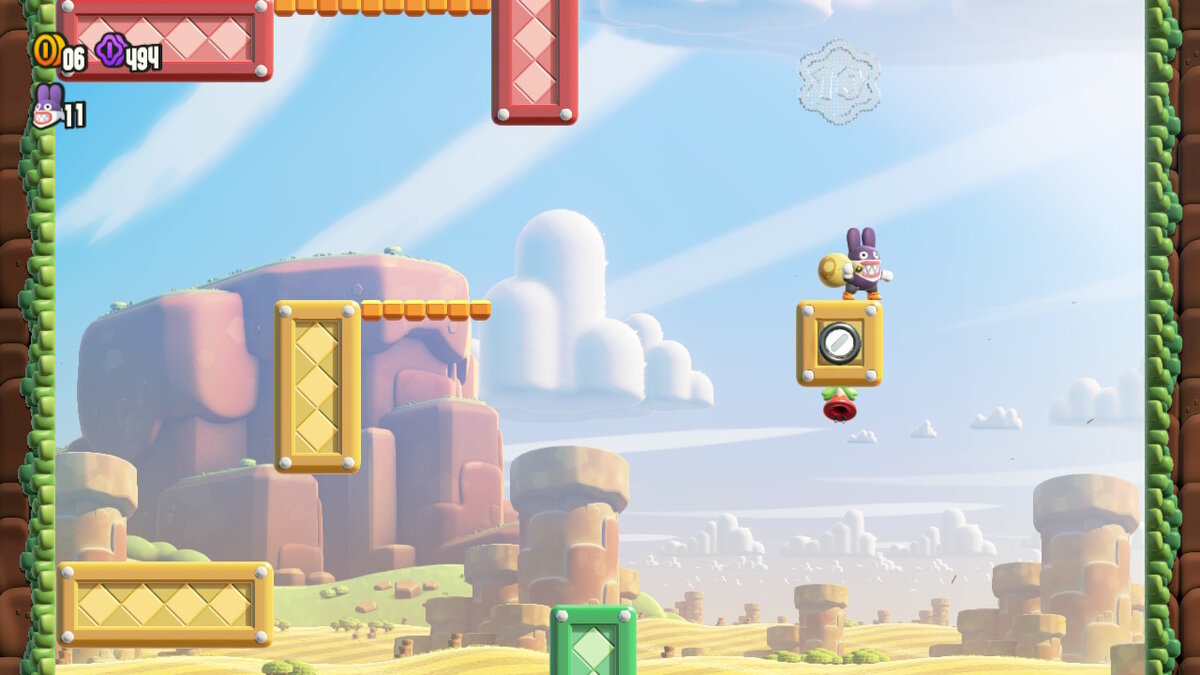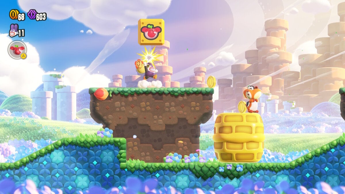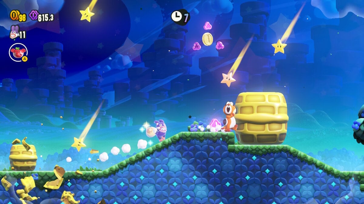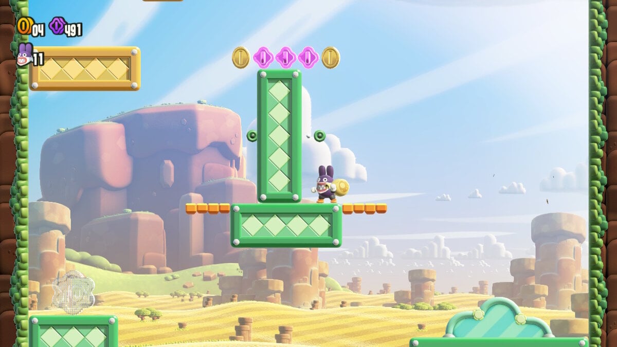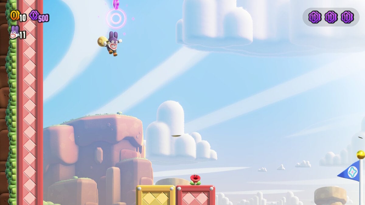 Next up, revisit Scram, Skedaddlers! on the tutorial section of Mario Wonder. It is impossible to die as Nabbit on this level. Focus on picking up the Purple ’10’ Coins and every Flower Coin drop.