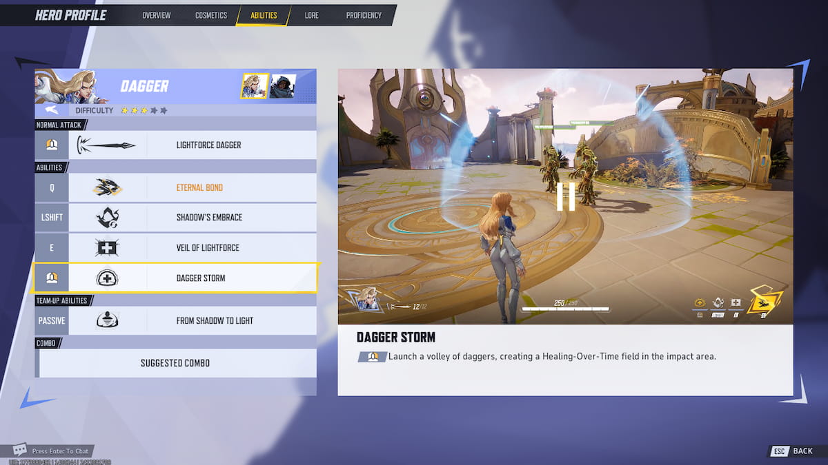 | Dagger: Dagger Storm Cloak: Dark Teleportation | Dagger Storm: Dagger throws down a volley of daggers which heals allies inside it over time, allowing them to hold a spot. Dark Teleportation: Cloak makes allies around him phased, which makes them invulnerable and invisible to enemies, while also giving them enhanced movement speed. | RMB | LT/R2 |