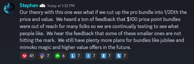 “Our theory with this one was what if we cut up the pro bundle into 1/20th the price and value,” the dev wrote. “We heard a ton of feedback that $100 price point bundles were out of reach for many folks so we are continually testing to see what people like. We hear the feedback that some of these smaller ones are not hitting the mark. We still have plenty more plans for bundles like Jubilee and Mimoko Magic and higher value offers in the future.”