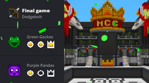 After all eight mini-games chosen for MCC 25 were played, the two teams that scored the most coins were the Green Geckos and the Purple Pandas. These two teams moved forward to a finale Dodgebolt duel to see who could win it all and be crowned the victor of the entire MCC 25 event.