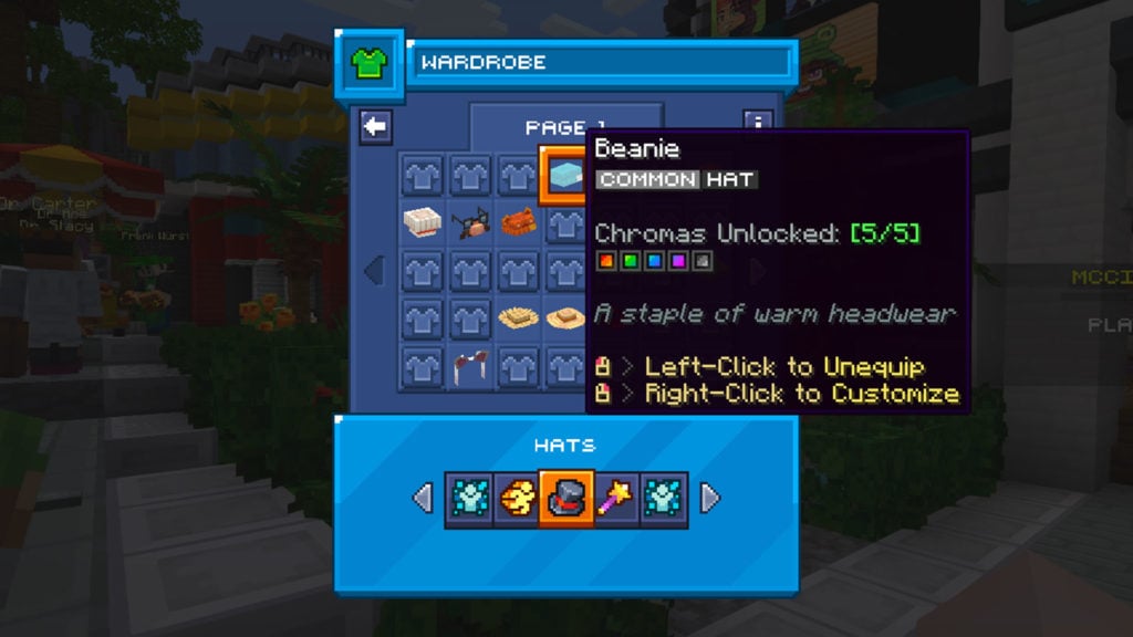 This type of cosmetic is pretty self-explanatory, but the MCC Island team has many variations and options when it comes to the types of hats players can attain. They even have one that is an entire Decision Dome, which avid MCC watchers will know as the location where teams choose which game will be played next, that players can place atop their heads.
