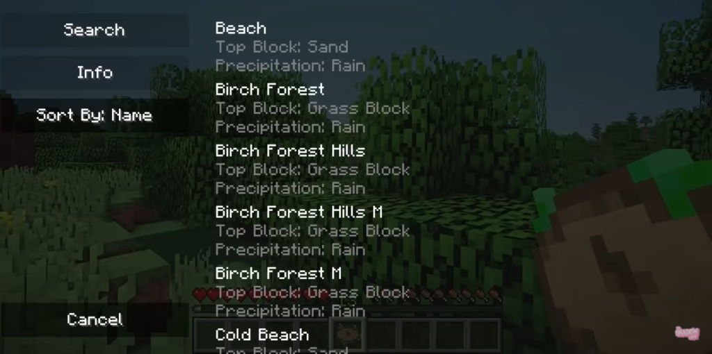 Factors specific to each biome are also identified by the compass. This includes features like the most common block in the biome, the precipitation, and the climate. Nature’s Compass can be installed here.