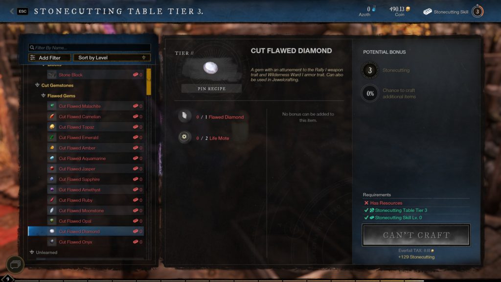 Once you have some Raw Gemstones, you can take them to the Stonecutting table to start crafting them into Cut Gemstones. Even if you’re never cut stone before, you can still craft Cut Flawed versions of any gemstones as long as you have a single Flawed Raw Gemstone and two of the corresponding motes. Because of the mote requirement, you’ll need to increase your Harvesting and Mining skills to get the needed materials.