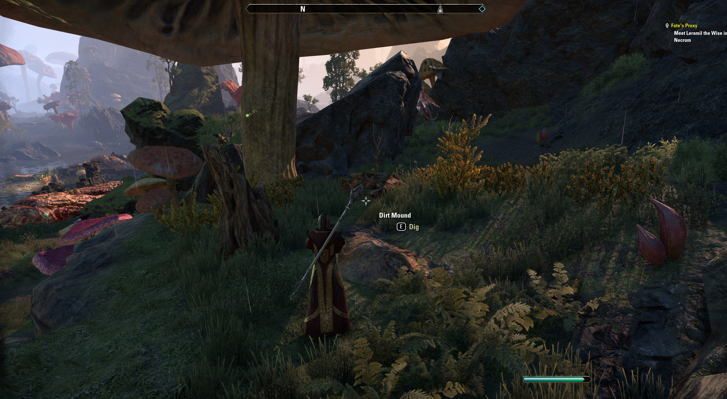 Directly south of this mushroom will be the dirt mound. Interact with the dirt to collect your treasure. We found a variety of weapons, a soul gem, a lead, and some gold.