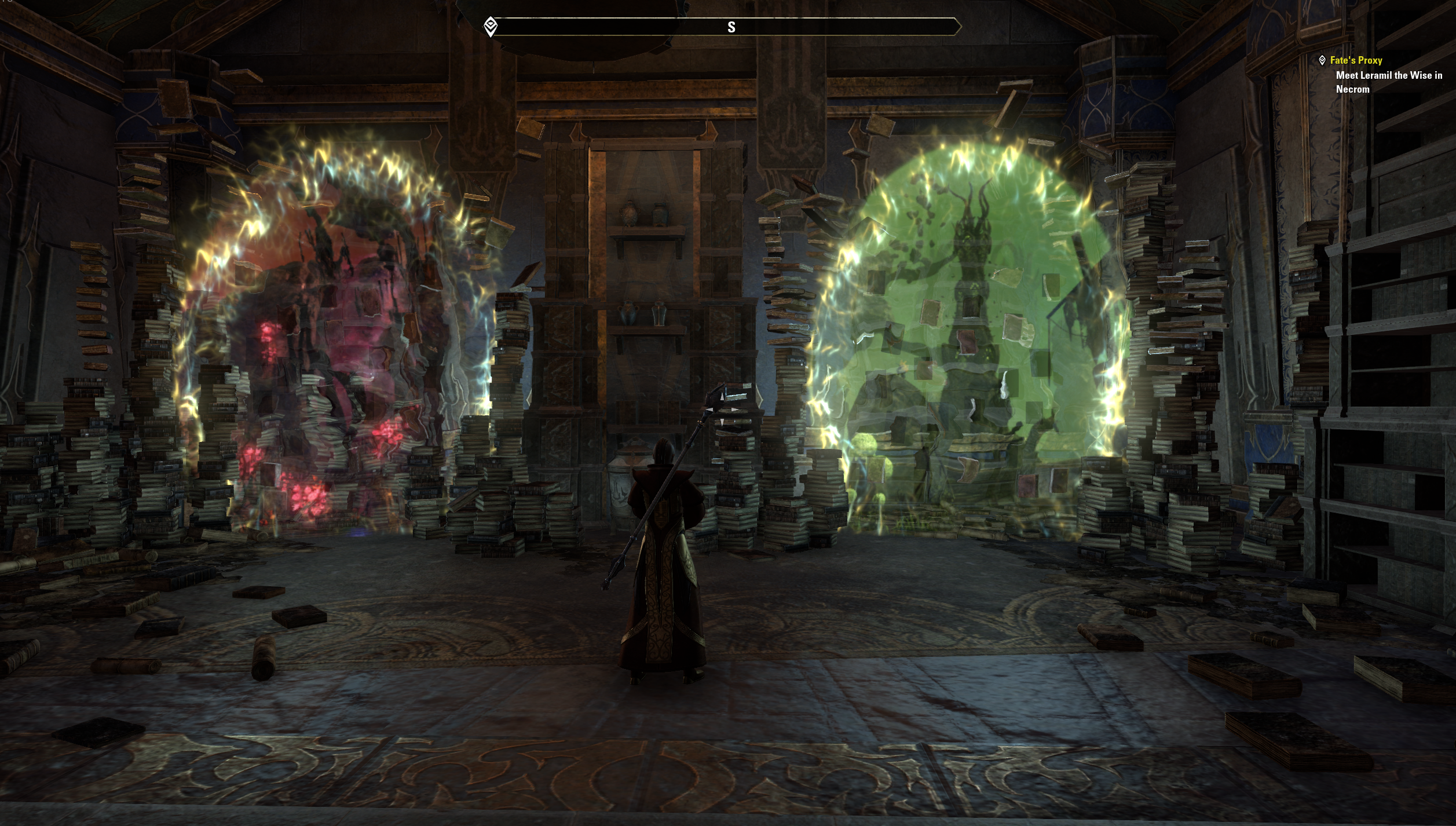 To find this location, you’ll need to head to Apocrypha, Hermaeus Mora’s realm. When you first step onto the Telvanni Peninsula, it’s not immediately clear how to get to Apocrypha. Unlike with the peninsula, you won’t automatically have any wayshrines unlocked for you in the other realm. If you head to the Necrom Bindery marked on the map below, however, you’ll find two portals in the building. The red one on the left will take you to the northwestern-most wayshrine in Apocrypha, while the green one will take you to the opposite side of the realm, the southeastern-most wayshrine.