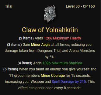 Claw of Yolnahkriin only drops from the Sunspire Trial in the Elsweyr DLC, but its benefits can be worth the trouble you’ll go through if you want to farm it. It gives you some health and stamina, as well as Minor Aegis, but the icing on the cake is the possibility of applying Minor Courage to you and nearby allies when you taunt—which, in the case of a tank, happens often. Run the Veteran version of Sunspire for a shot at the Perfected version of it, which grants you extra health.
