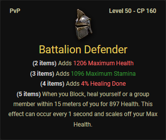 Tanks will be blocking and taking damage all the time, and the Batallion Defender set leans into that space by giving players more health, stamina, and healing received. As the crown jewel of the set, wearing five pieces of it will heal yourself or another group member within 15 meters of you whenever you block, with a cooldown of one second. As long as you have the stamina to block, you can continue pushing out small heals, which will improve your sustain.