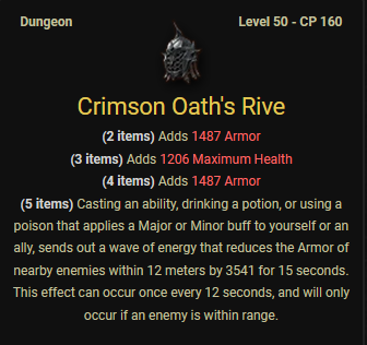 Most tanks are constantly taunting and need potions to improve their sustain. The Crimson Oath’s Rive set will inflict a high debuff on enemies whenever these scenarios happen. Casting an ability or drinking a potion will reduce enemies’ armor for 15 seconds with a 12-second cooldown. Since you’ll likely be reapplying your taunts every 15 seconds anyway, you can keep this up as long as you have resources to taunt. And if you don’t, drinking a potion will fill up your resources and debuff enemies in the process.