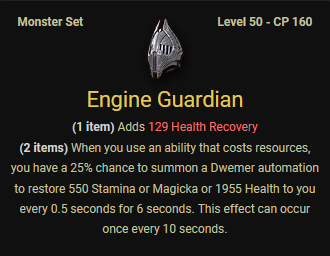 The Engine Guardian set can vastly help your sustain. Every time you use an ability, the set can summon a Dwemer Spider that will recover either your stamina (to let you keep blocking) or health, keeping you in the fight for longer.