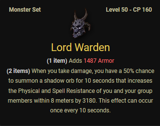 This Monster set drops from the Imperial City Prison, while the shoulders can be obtained from the Undaunted chest whenever Lord Warden is a reward. Taking damage has a 50-percent chance of boosting Physical and Spell Resistance for you and your allies, and taking damage will happen often as a tank.
