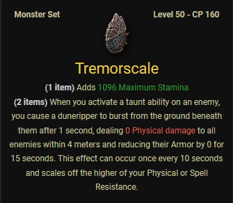 The Tremorscale set gives you some stamina and causes a Duneripper to burst from the ground whenever you taunt, shredding through enemies’ armor and reducing it by a considerable amount. It’s a debuff that can synergize with other harmful effects on your enemy, and it makes for a field day for your stamina DPS.