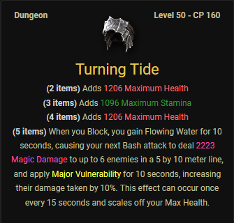 Turning Tide launched alongside the Ascendant Tide DLC and quickly became a must-have for tanks. Not only does it get you some health and stamina, but you can also apply Major Vulnerability to enemies with a bash. The effect lasts for 10 seconds and is on a 15-second cooldown, so you can get some regular uptime on it.