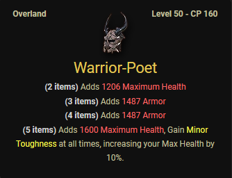 Much like the Plague Doctor set, Warrior-Poet offers you benefits in the form of sheer health. It’s also an Overland set, meaning you’ll find heaps of it in Guild Traders everywhere, and you can easily mix and match it with other harder-to-obtain sets.