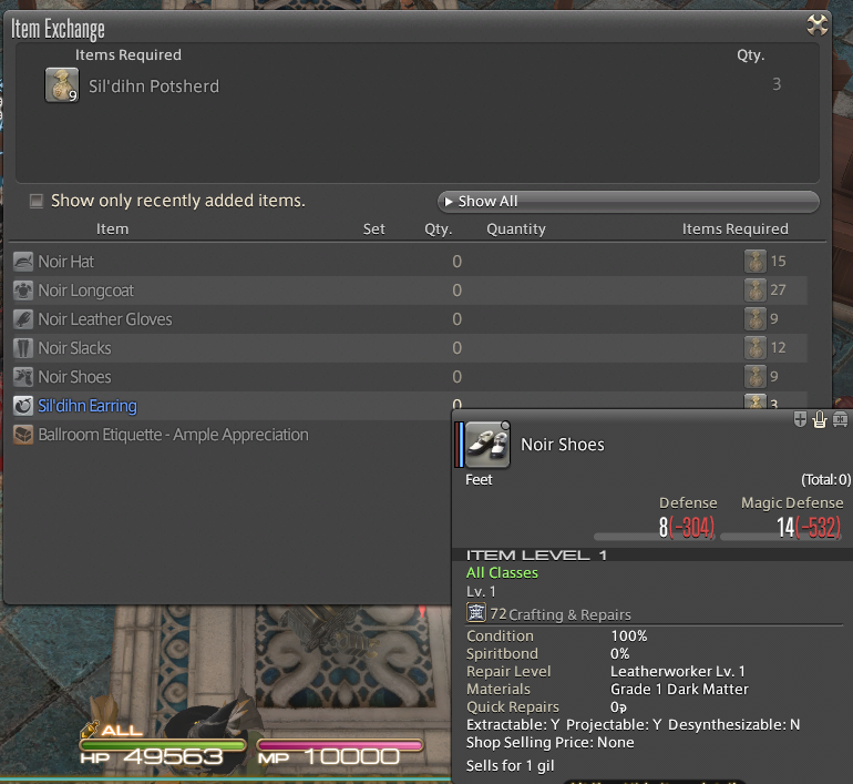 The players can get the Noir outfit by trading them to Trisassant, in Old Sharlayan (X: 12.0, Y: 13.5). He will exchange them for Sil’dihn Potsherds.
