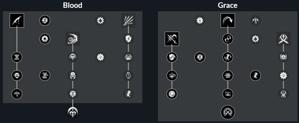 In the Blood tree, your other active abilities have high potential for damage, but because of your light armor, you will want to grab abilities from the Grace tree to improve your survivability.