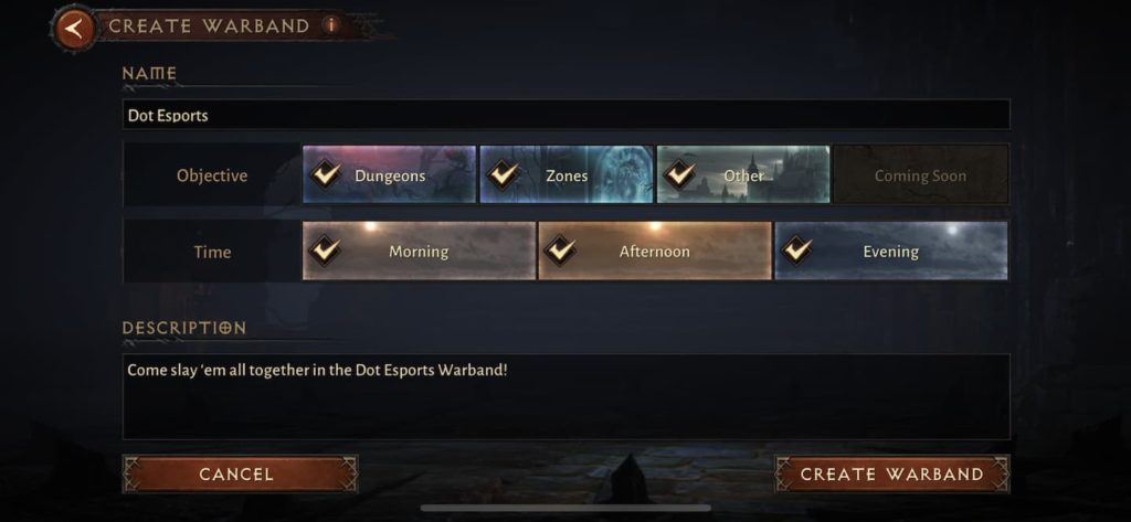 Additionally, players can create their own Warband by selecting the “Create Warband” button. This will send players to a new interface where they will name their Warband and provide a brief description. On top of that, Warband leaders will select certain attributes that best fit the Warband.
