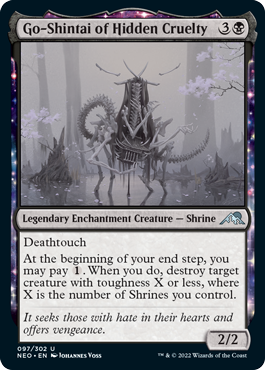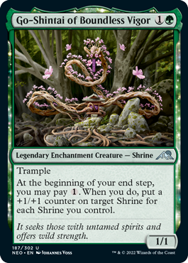 All of the Go-Shintai have an ability that activates during your end step and requires you to pay one generic mana. They all have effects that scale with the number of shrines you control, too. They also all have one static keyword ability.