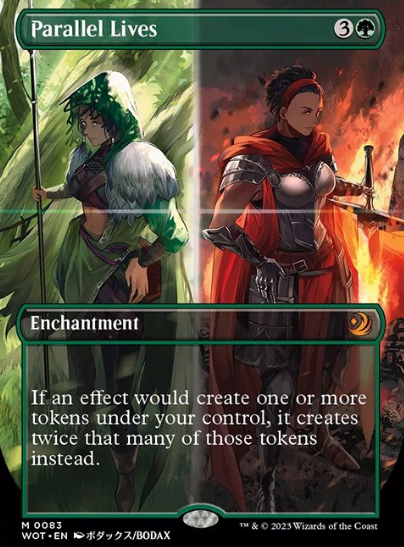 The Enchanting Wilds bonus sheet within the WOE set contains a total of 63 cards. Of the 63 cards, 20 feature illustrations by Japanese artists with a borderless frame. Players can find these anime illustrations and bonus sheet Enchantment MTG cards through Wilds of Eldraine booster packs. Both the normal and anime versions are found in the same slot.