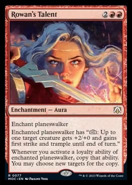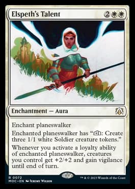There are a total of five enchant planeswalker Talent cards in the MOM set designed to get played in Commander and Eternal formats. Each Talent has a famous planeswalker in its name that typically represents the color of that Enchantment Aura.