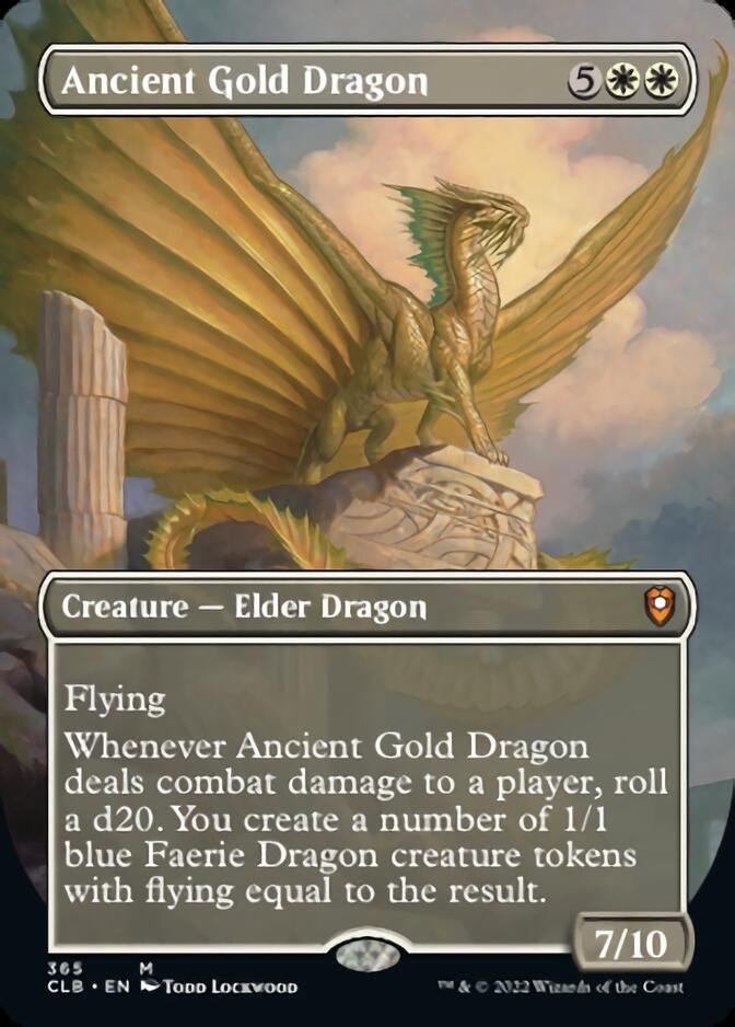 Ancient Gold Dragon taps into Dungeons and Dragons themes with a d20 ability that produces Blue faerie dragon tokens. The Elder Dragon is played in a variety of Commander decks, like the other Elder Dragons, and is the least valuable dragon from the CLB cycle.