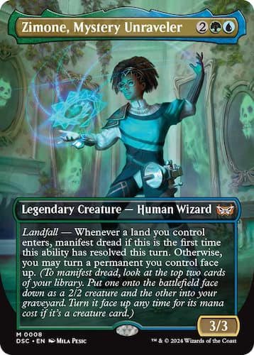 The Jump Scare Commander deck is all about Manifest Dread synergy with a splash of graveyard shenanigans as an extra payoff. The Zimone, Mystery Unraveler uses Landfall to trigger Manifest Dread, making it the other main mechanic within the Duskmourn Precon.