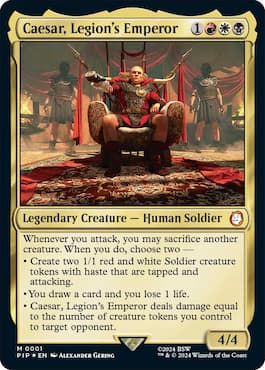 Featuring Mardu colors RWB (Red, White, and Black) with go-wide token and sacrifice strategies is the Hail, Caesar Precon. The face commander for the MTG Fallout deck is Caesar, Legion’s Emperor who has three modal options that players can choose two of when the human solder attacks and sacrifices another creature.