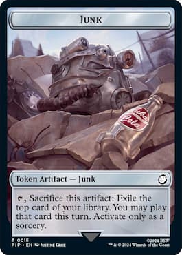 Showcasing the new MTG Junk tokens is the Fallout Precon deck, Scrappy Survivors. The Commander deck is in Naya colors RGW (Red, Green, and White), featuring a strong Aura and Equipment theme in conjunction with Artifacts.