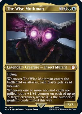 Leading the MTG Fallout deck is The Wise Mothman, an insect mutant that creates Rad counters while also benefiting from the counters Milling nonland cards. The Wise Mothman’s second ability triggers off all players, not just you.