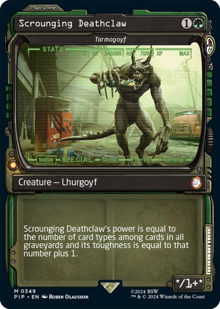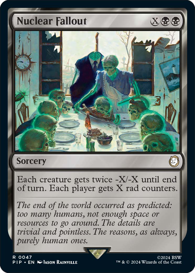 Use cards like Nuclear Fallout if the opponent is getting ahead on board to reset and flood them with rad counters, then drop a gigantic Tarmogoyf which returns with its own Fallout theme in the form of the Scrounging Deathclaw.