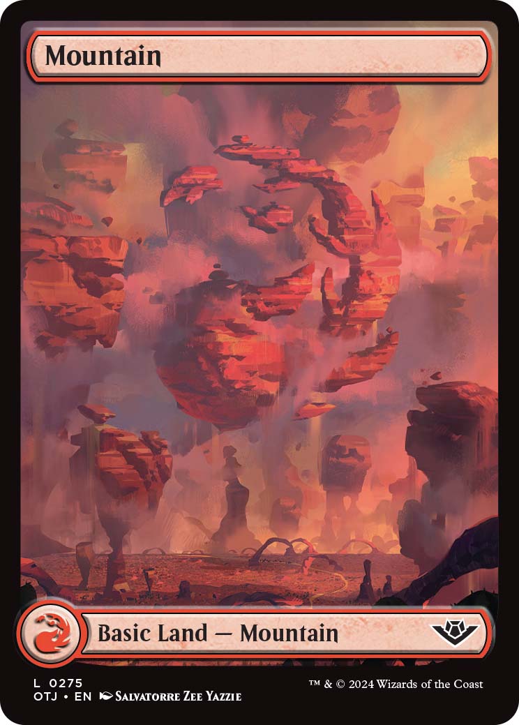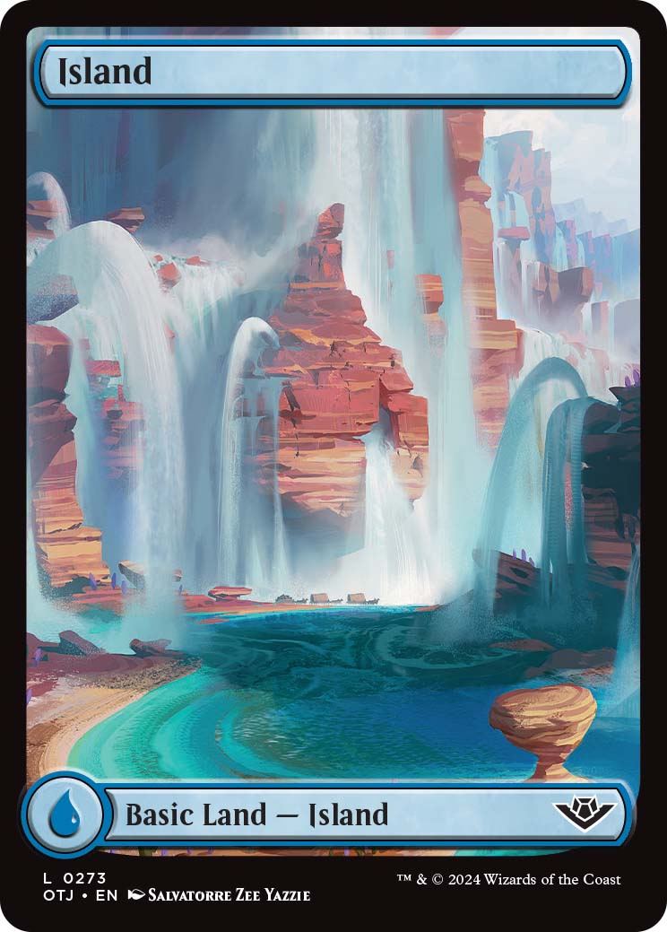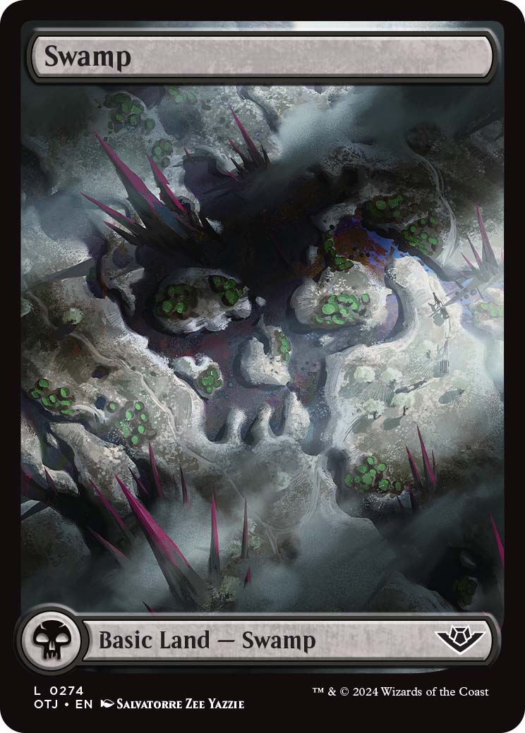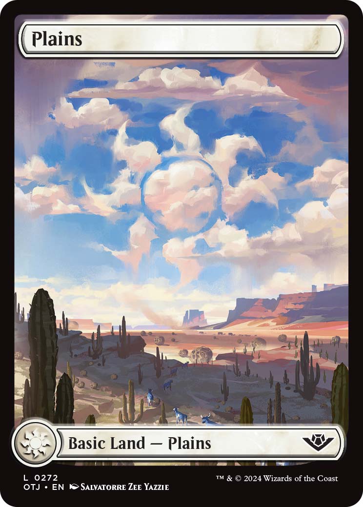 All of the full-art OTJ Basic lands display a Western theme, which I am a fan of. Of the five, Plains and Swamp are my favorites because of how the land symbol was worked into the art. Full art lands are available through both Play and Collector booster packs.