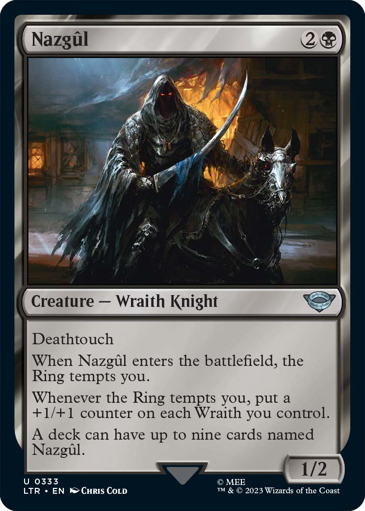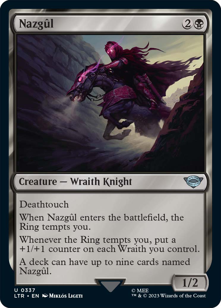 Having nine different art variants within the LTR set is Nazgul. The Uncommon allows players to put up to nine copies of the wraith knight into a deck, which is very powerful in a format like Commander, where players can only have one copy of a card unless otherwise specified. The Nazgul are in high demand, with various art variants having different prices.