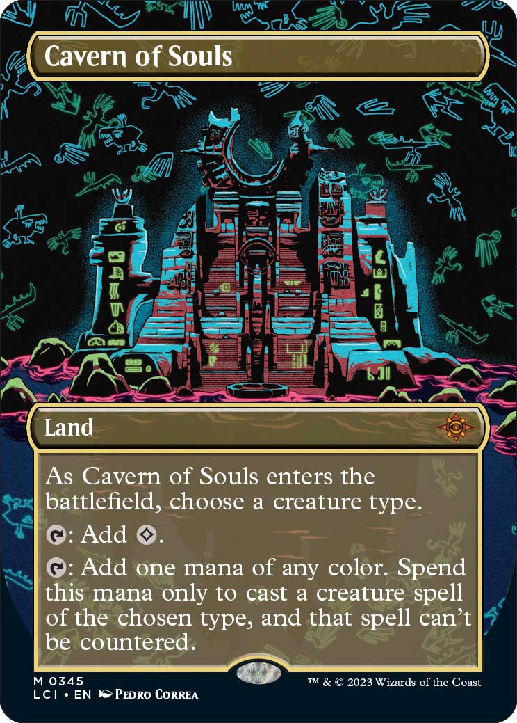 The popular MTG land Cavern of Souls was reprinted in the LCI set, packing value through its normal and borderless versions in addition to the Neon Ink variants.