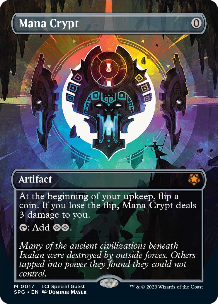 Chase cards in Lost Caverns of Ixalan (LCI) range from Neon Ink variants of Mana Crypt and Cavern of Souls to Jurassic World and Special Guest cards. Neon Ink variants are expected to be priced high as collectors and players have less than a one percent chance of pulling them from an LCI collector booster pack.