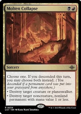 Zoyowa Lava-Tongue synergizes with Descend, pinging three damage to an opponent if you Descended and the opponent didn’t either discard a card or sacrifice a creature. And the Rare signpost is Molten Collapse, a solid two-drop modal option Sorcery removal spell.