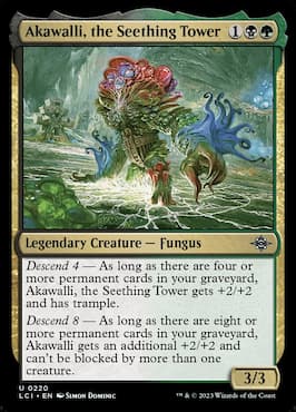 Graveyard shenanigans are back through the BG Fungal Festering LCI Draft archetype, using the Descend mechanic. The Uncommon signpost is Akawalli, the Seething Tower, a Legendary Fungus with Descend Four and Descend Eight on a three-drop with 3/3 baseline stats.