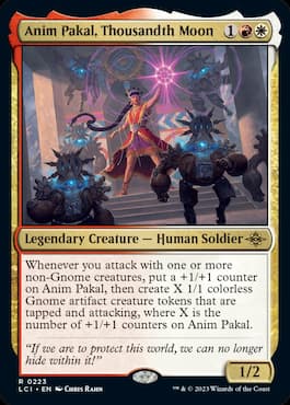 Leading the RW Draft archetype in LCI as the Rare signpost is Anim Pakal, the Thousandth Moon. The Legendary human soldier is a three-drop with 1/2 stats and has Krenko, Tin Street Kingpin feels. When Anim Pakal, the Thousandth Moon attacks, it creates 1/1 Gnome tokens that also attack. And when the Gnome tokens attack, the soldier gets a +1/+1 counter on it.
