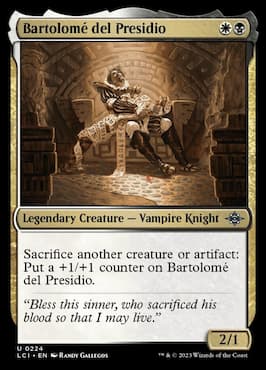 Behold the power of Vampires in the BW Draft archetype, featuring Bartolomé del Presidio as the Uncommon signpost. The Legendary vampire knight thrives on sacrificing a creature or Artifact to scale in power and toughness.