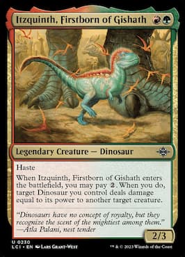 Dinosaurs are back in LCI, showcased in the RG Draft archetype. Big dinos are ready to squash opponents with the help of the Uncommon signpost Itzquinth, Firstborn of Gishath. The Legendary Dino is a two-drop with Haste that has a Kicker-like ETB cost of two that can have another dinosaur you control to use its power to Bite (deal damage without fighting) another target creature.