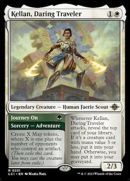 Kutzil, Malamet Exemplar can also provide card advantage. And the Rare signpost is Kellan, Daring Traveler, an Adventure that is Mono-White to cast and has a Green Sorcery spell.