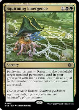 Slotting into the BG archetype as a Rare signpost is Squirming Emergence, a three-drop Sorcery spell with Fathomless Descent.