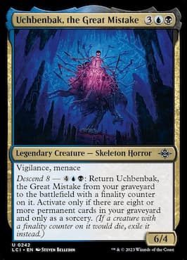 The Uncommon signpost is Uchbenbak, the Great Mistake, a five-drop with Vigilance, Menace, and Descend Eight. And the Rare is Wail of the Forgotten, which also has Descend Eight on a two-drop Sorcery modal option spell.