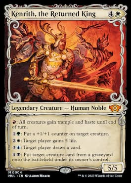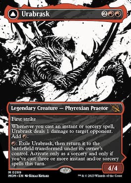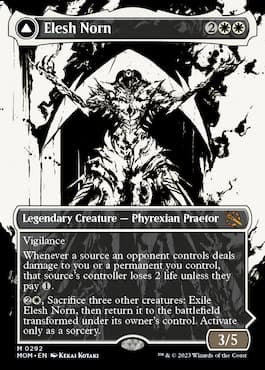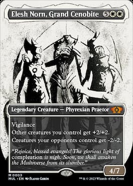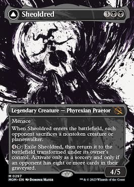 Sheoldred is from a cycle of MOM cards that feature a Praetor on the frontside and a Saga on the backside. Most often played in Commander, the Phyrexian also sees play in the Pioneer format.