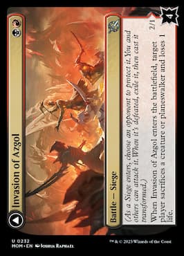 Limited players within the MOM set will have multiple options to pick from regarding gold signpost cards. There are 10 Uncommon rarity Battle signposts, 10 Uncommon rarity creature signposts, and 10 Rare gold legendary mashup signpost cards. The legendary team-up gold cards, however, don’t typically synergize directly with archetypes’ theme. Each Uncommon gold signpost card features mechanics and themes that align with a two-color MOM Limited archetype.