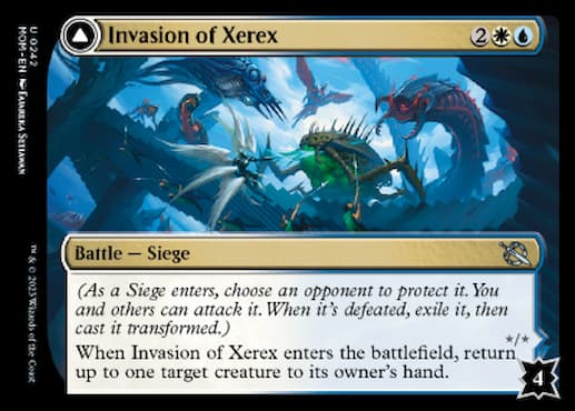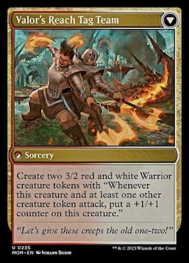 There are 10 dual-color archetypes within the MOM set that also have their own gold Uncommon signpost creatures. And in addition to Battles and gold signpost cards with a rarity of Uncommon are five Mythic Rare and 10 Rare legendary mashups. The Mythic Rare cards showcase three color legendary team-ups while the 10 Rare mashups are like an extension of the 10 archetypes within the MOM set.