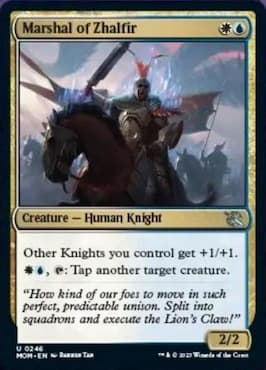 The WU archetype has a strong knight tribal theme designed into it. Marshal of Zhalfir is a two-drop lord for knight tribal decks. The other gold signpost cards in WU can support knights but instead, have staple effects and abilities that synergize with the colors Blue and White as a whole.