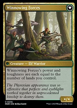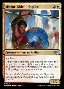 The Green and White MOM archetype has a theme of +1/+1 counters. Botanical Brawler, the Uncommon gold signpost, scales in power anytime counters are added to a permanent during that turn, synergizing with the Backup mechanic in the set as well.
