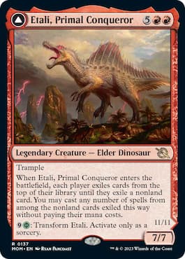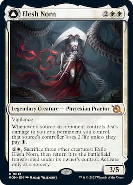 The Transform mechanic within the MOM set is an activated ability that has a cost that needs to get paid for a card to flip and Transform. These activated costs can vary. On Elesh Norn, for example, the activated Transform cost is 2W and the sacrificing of three creatures. On Etali, Primal Conqueror, the Transform cost is 9G/P (P is Phyrexian mana).