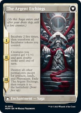 Once an Incubate token exists, its controller can pay a Transform cost of two mana of any color to flip it over to the backside of the token, creating a Phyrexian Artifact creature with 0/0 stats. Some cards will have a trigger, like The Argent Etchings, that Transforms the Incubator tokens without its controller having to pay the two mana per token.